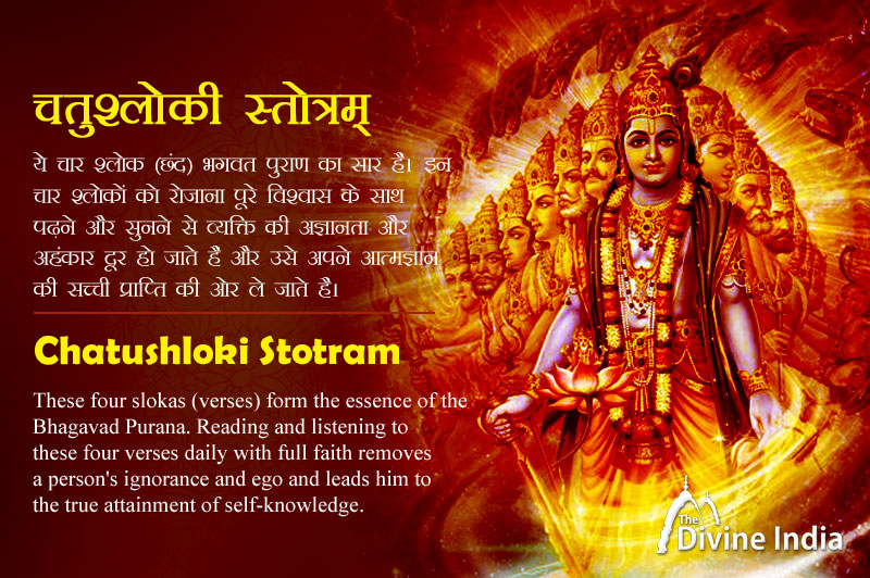 These four slokas (verses) form the essence of the Bhagavad Purana. Reading and listening to these four verses daily with full faith removes a person's ignorance and ego and leads him to the true attainment of self-knowledge. The person who reads and listens to them becomes free from sins and walks on the true path in his life.