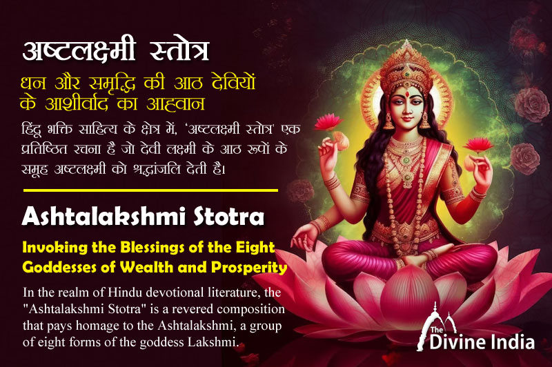 हिंदू भक्ति साहित्य के क्षेत्र में, "अष्टलक्ष्मी स्तोत्र" एक प्रतिष्ठित रचना है जो देवी लक्ष्मी के आठ रूपों के समूह अष्टलक्ष्मी को श्रद्धांजलि देती है। प्रत्येक रूप धन, समृद्धि और कल्याण के एक विशिष्ट पहलू का प्रतिनिधित्व करता है। अष्टलक्ष्मी स्तोत्र एक सुंदर और शक्तिशाली प्रार्थना है जो इन दिव्य देवी-देवताओं का आशीर्वाद मांगती है, जो जीवन में प्रचुरता के विभिन्न स्रोतों का प्रतीक है।