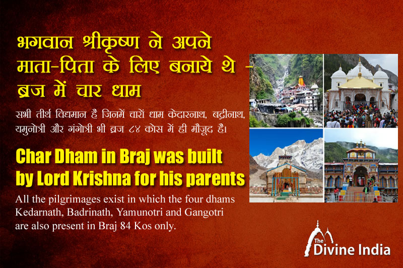 भगवान श्रीकृष्ण ने अपनी माता यशोधा और पिता नंद बाबा के लिए ब्रज की धरती पर ही चार धाम का निर्माण किया था। वैसे ये चार धार - यमुनोत्री, गंगोत्री, केदारनाथ और बद्रीनाथ भारत के राज्य उत्तराखंड में स्थित है। भगवान श्रीकृष्ण ने अपने माता-पिता को चार धाम की यात्रा पर जाते देख और चार धाम यात्रा कठनाईयों को देखते हुए ब्रज की धरती पर ही चार धाम का आह्वान करके बुलाया था। इसके बाद एक-एक करके सारे तीर्थ ब्रज में आ गए। ये भी माना जाता है कि इन चार धाम के दर्शन से ही लोगों की मनोकामनाएं पूर्ण हो जाती हैं।