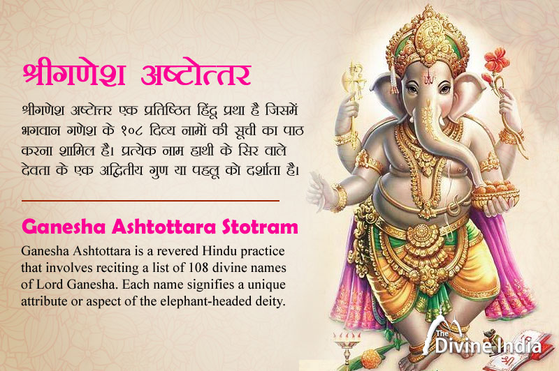गणेश अष्टोत्तर एक प्रतिष्ठित हिंदू प्रथा है जिसमें भगवान गणेश के 108 दिव्य नामों की सूची का पाठ करना शामिल है। प्रत्येक नाम हाथी के सिर वाले देवता के एक अद्वितीय गुण या पहलू को दर्शाता है। भक्त भक्ति के रूप में इन नामों का जाप करते हैं, भगवान गणेश से आशीर्वाद और मार्गदर्शन मांगते हैं, जिन्हें बाधाओं को दूर करने वाला और सफलता और समृद्धि का अग्रदूत माना जाता है। यह पवित्र पाठ अक्सर गणेश पूजा अनुष्ठानों के दौरान किया जाता है, और यह भगवान गणेश की दिव्य उपस्थिति से जुड़ने का एक तरीका है।