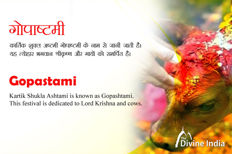 कार्तिक शुक्ल अष्टमी गोपाष्टमी के नाम से जानी जाती है। यह त्योहार भगवान श्रीकृष्ण और गायों को समर्पित है। यह मथुरा, वृंदावन और अन्य ब्रज क्षेत्रों में प्रसिद्ध त्योहार है। इस दिन गायों को उनके बछड़े के साथ सजाने और पूजा करने की परंपरा है। आज के दिन श्रीकृष्ण के पिता नंद महाराज ने श्रीकृष्ण को गायों की देखभाल की जिम्मेदारी दी थी और श्रीकृष्ण गायों को चराने वन ले गये थे।