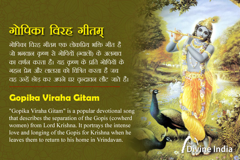 "गोपिका विरह गीतम" एक लोकप्रिय भक्ति गीत है जो भगवान कृष्ण से गोपियों (ग्वालों) के अलगाव का वर्णन करता है। यह कृष्ण के प्रति गोपियों के गहन प्रेम और लालसा को चित्रित करता है जब वह उन्हें छोड़ कर अपने घर वृन्दावन लौट जाते हैं। गोपियाँ दुःखी हैं और प्रेम और विरह के गीत गाती हैं।