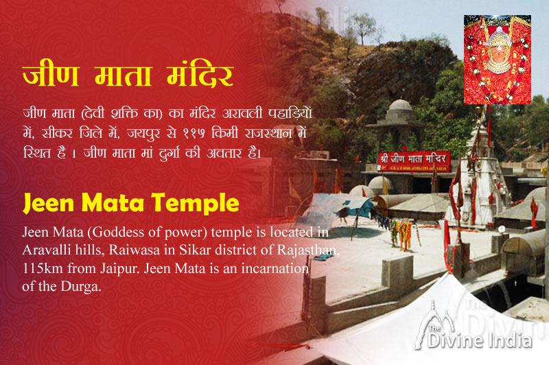 जीण माता (देवी शक्ति का) का मंदिर अरावली पहाड़ियों में, सीकर जिले में, जयपुर से 115 किमी राजस्थान में स्थित है । जीण माता मां दुर्गा की अवतार है। जीण माता मंदिर शक्ति पीठ के रूप में जाना जाता है और असली नाम जंयतीमाला था। जीण माता के पवित्र मंदिर को एक हजार साल पुराना माना जाता है। इस मंदिर के निर्माण का सही समय पता नहीं है। ऐसा माना जाता है पांडवों काल के दौरान जब पांडवो को हस्तिनापुर से निर्वासन के दौरान पांडवों द्वारा बनाया गया था। जीण माता मंदिर शुरुआती समय से तीर्थ यात्रा की एक जगह रही थी और कई बार इस मंदिर कि मरम्मत की गई थी और कई बार फिर से बनाया था। मंदिर के चारों तरफ प्राकृतिक वनस्पति व जीव-जन्तुओं का सन्दुर नजारा है। मंदिर की वास्तुकला बहुत अच्छी है। मंदिर के मुख्य हाॅल के सभी खंभों पर उपर से नीचे उत्कीर्ण वनस्पतियों, फूल पत्तियां और जानवरों, नर्तकों और देवताओं के चित्र से कवर किया गये है।