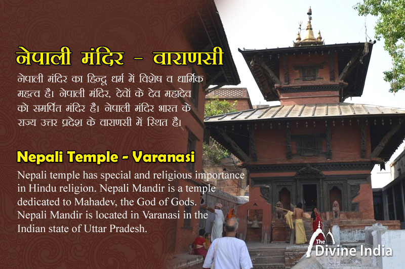 नेपाली मंदिर को नेपाल के काठमांडू में स्थित पशुपतिनाथ के प्रतिकृति माना जाता है। इस मंदिर का निर्माण 19वीं शताब्दी में नेपाल के राजा द्वारा किया गया था। मंदिर का निर्माण टेराकोटा पत्थर और लकड़ी से किया गया है। मंदिर के गर्भगृह में पशुपतिनाथ के रूप में शिवलिंग स्थापित हैं। माना जाता है कि काशी के इस पशुपतिनाथ के दर्शन से वही फल प्राप्त होता है जो नेपाल के पशुपतिनाथ के दर्शन से होता है।