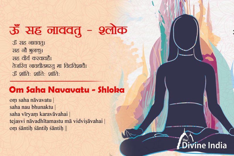 अर्थ: प्रभु हमारी रक्षा करें, प्रभु हम दोनों का पोषण करें, हम दोनों मिलकर वीरतापूर्ण कार्य करें, समस्त ब्रह्माण्ड को अमरत्व प्रदान करें, हम दोनों की विद्या उज्ज्वल हो, हम एक दूसरे से नफरत न करें, ओम शांति, शांति शांति।