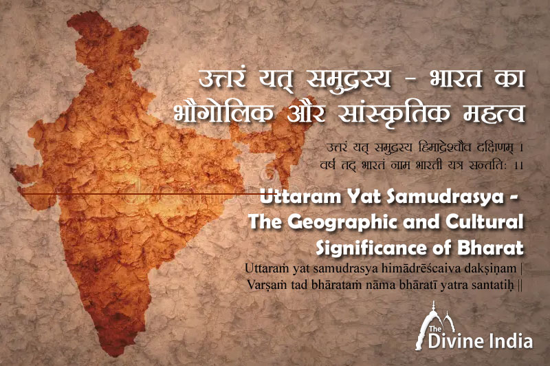 यह श्लोक भारत की भौगोलिक सीमाओं को चित्रित करने से शुरू होता है। इसमें "उत्तरं" का उल्लेख है, जिसका अर्थ उत्तर है, और "समुद्रस्य" का अर्थ है दक्षिण में समुद्र या महासागर। "हिमाद्रेश", उत्तर में राजसी हिमालय पर्वत श्रृंखला को संदर्भित करता है। यह संक्षिप्त विवरण भारतीय उपमहाद्वीप के उत्तरी पहाड़ों से लेकर दक्षिणी समुद्र तक के विशाल विस्तार को समाहित करता है।