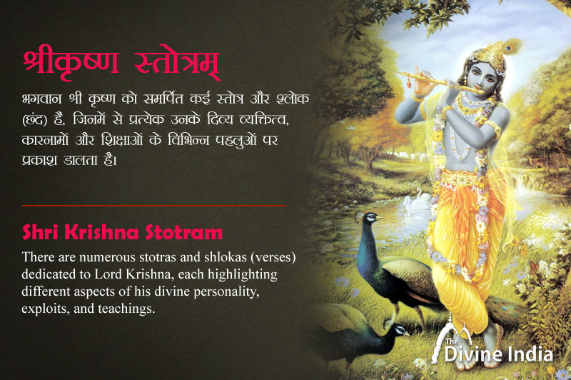 "Krishna Stotra" refers to a devotional hymn or prayer dedicated to Lord Krishna, one of the most revered deities in Hinduism. There are numerous stotras and shlokas (verses) dedicated to Lord Krishna, each highlighting different aspects of his divine personality, exploits, and teachings.