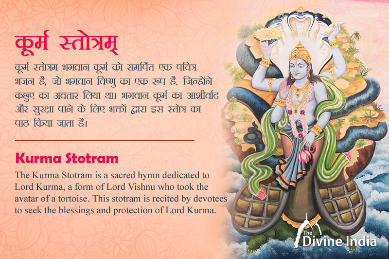 The Kurma Stotram is a sacred hymn dedicated to Lord Kurma, a form of Lord Vishnu who took the avatar of a tortoise. This stotram is recited by devotees to seek the blessings and protection of Lord Kurma. It is often chanted during rituals, prayers, and meditation dedicated to Lord Vishnu or when seeking guidance and support in times of difficulty.