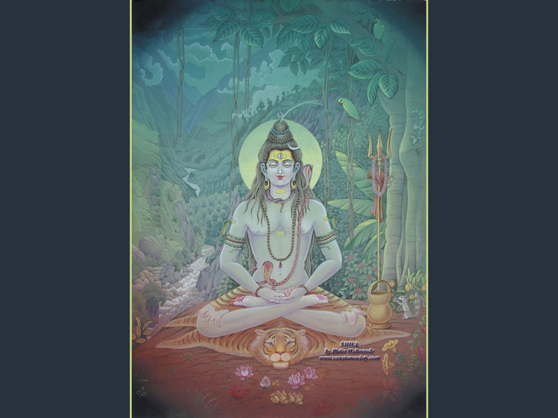 He is seated on a lotus seat and is constantly praised by the demigods. His form is covered with Vyaghra-skin (tiger skin). He is the beginning and seed of the universe, the destroyer of all fear, Panchamukhi (five-faced) and Trinetradhari (three-eyed) Lord Maheshwara.