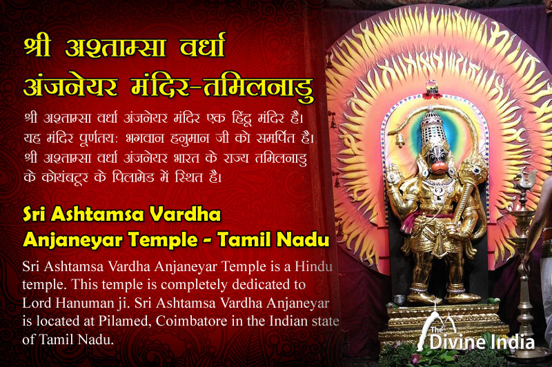 Sri Ashtamsa Vardha Anjaneyar Temple is a Hindu temple. This temple is completely dedicated to Lord Hanuman ji. Sri Ashtamsa Vardha Anjaneyar is located at Pilamed, Coimbatore in the Indian state of Tamil Nadu. It is believed that Sri Ashtamsa Vardha Anjaneyar is the oldest temple in the state of Tamil Nadu.